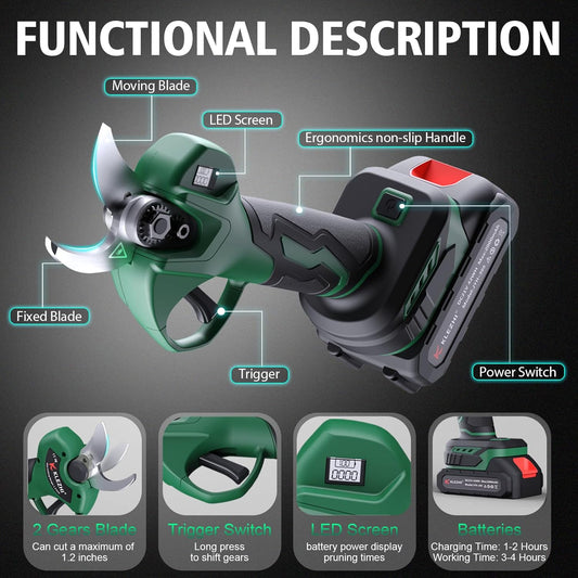 Cordless Electric Pruning Shears with 2×21V 2000Mah Batteries & LED Display, 1.2" Rechargeable Garden Pruning Shears for Thick Branches, Professional Landscaping Tools